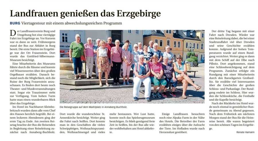 Vom 11.08. bis 14.08.2024 fand die Fahrt ins faszinierende Erzgebirge statt. 3 Übernachtungen im "Gasthof Fürstenthal" in Frauenstein, eine Erzgebirgsrundfahrt, Schloss Pilnitz, Silbermann Museum, ein Besuch in Dresden mit Reiseleitung sowie eine Schifffahrt auf der Elbe begeisterten alle Teilnehmer.